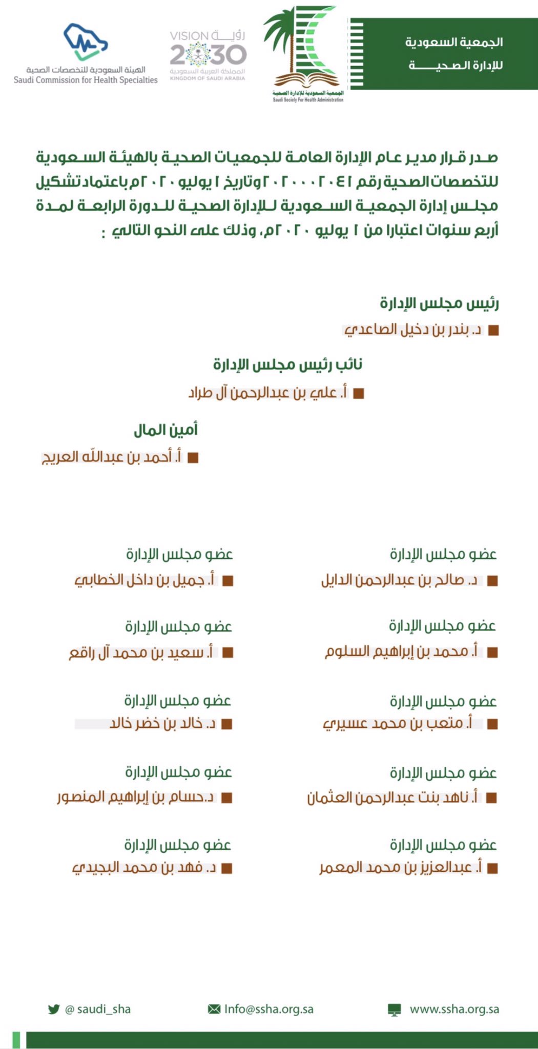 الجمعية السعودية للإدارة الصحية On Twitter تبارك الجمعية صدور قرار مدير عام إدارة الجمعيات بهيئة التخصصات الصحية باعتماد تشكيل مجلس إدارتها للدورة الرابعة بتاريخ ١ ٧ ٢٠٢٠م كما تهنئ أعضاء المجلس بثقة أعضاء الجمعية