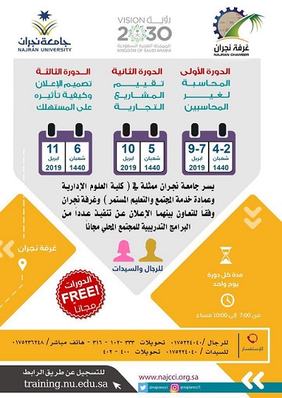 تعلن جامعة نجران ممثلة في كلية العلوم الادارية وعمادة خدمة المجتمع وبالتعاون مع غرفة نجران عن دورات