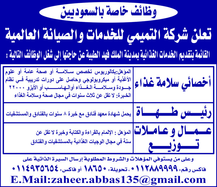 وظائف خاصة بالسعوديين من شركة التميمى للخدمات والصيانه العالمية