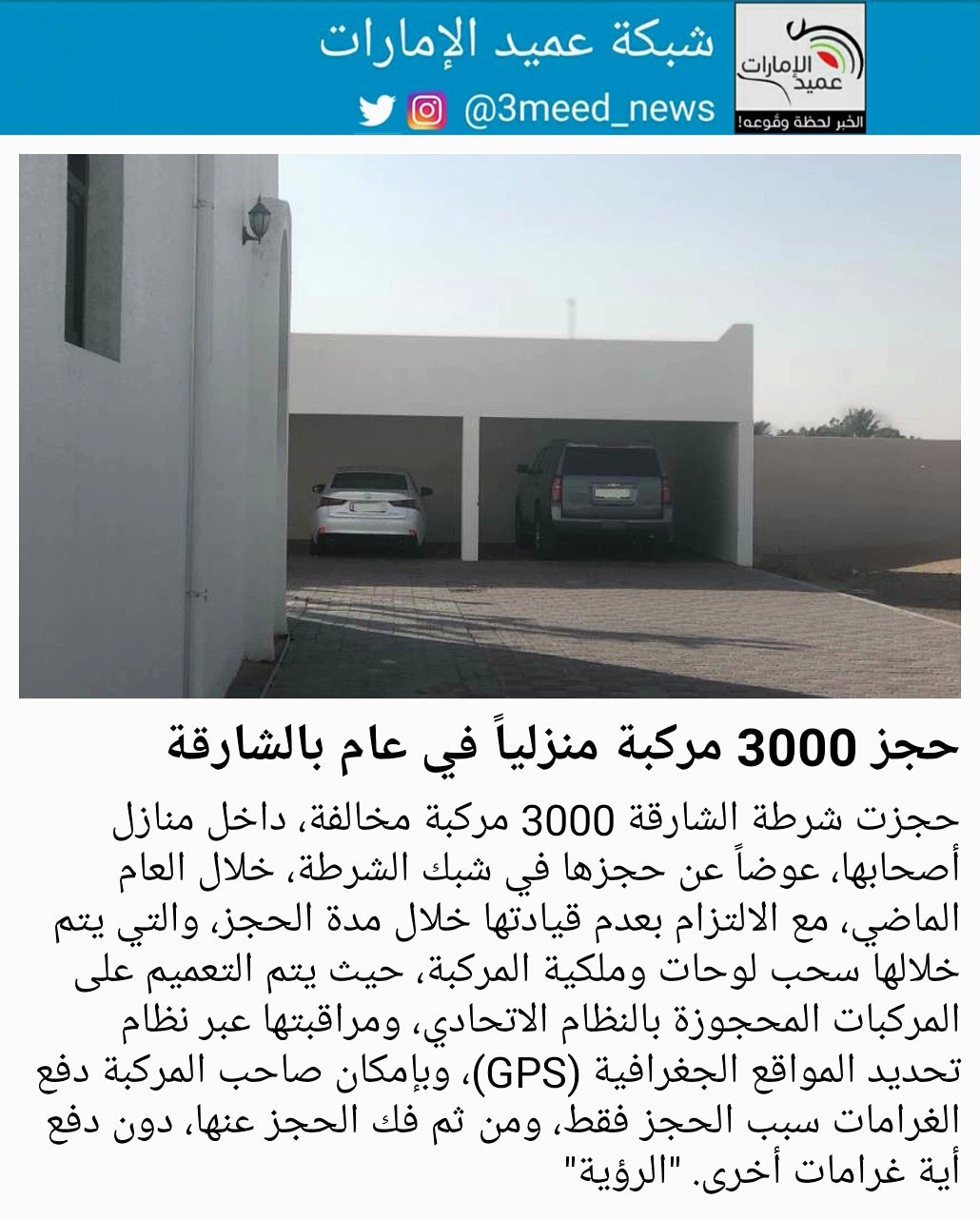 شبكة عميد الإمارات Twitter ನಲ ಲ حجزت شرطة الشارقة 3000 مركبة مخالفة داخل منازل أصحابها عوضا عن حجزها في شبك الشرطة خلال العام الماضي مع الالتزام بعدم قيادتها خلال مدة الحجز والتي يتم