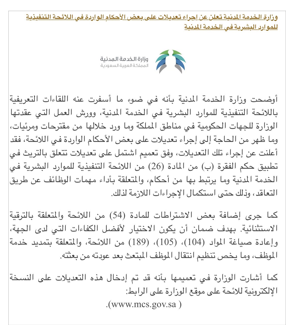 بوابة الموظفين نعود بحذر Twitter ನಲ ಲ وزارة الخدمة المدنية تعلن عن إجراء تعديلات على بعض أحكام اللائحة التنفيذية للموارد البشرية في الخدمة المدنية ومنها المادة 54 الخاصة بالترقية الإستثنائية Https T Co Rog5xp7jl7 اللائحة التنفيذية